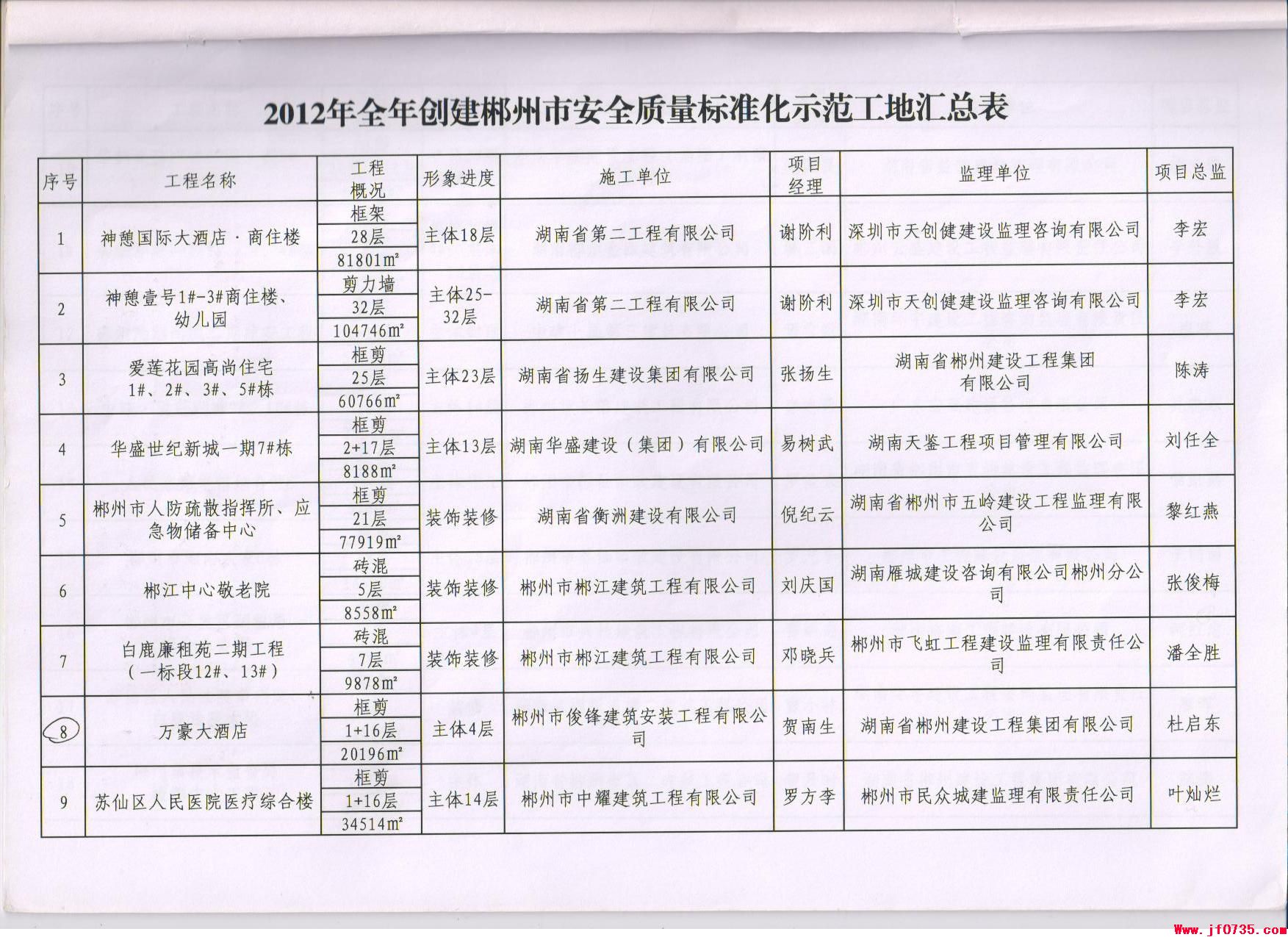 郴州市俊鋒建筑安裝工程有限公司建設(shè)的“萬豪大酒店”項(xiàng)目被評(píng)為“2012年郴州市安全質(zhì)量標(biāo)準(zhǔn)化示范工地”。