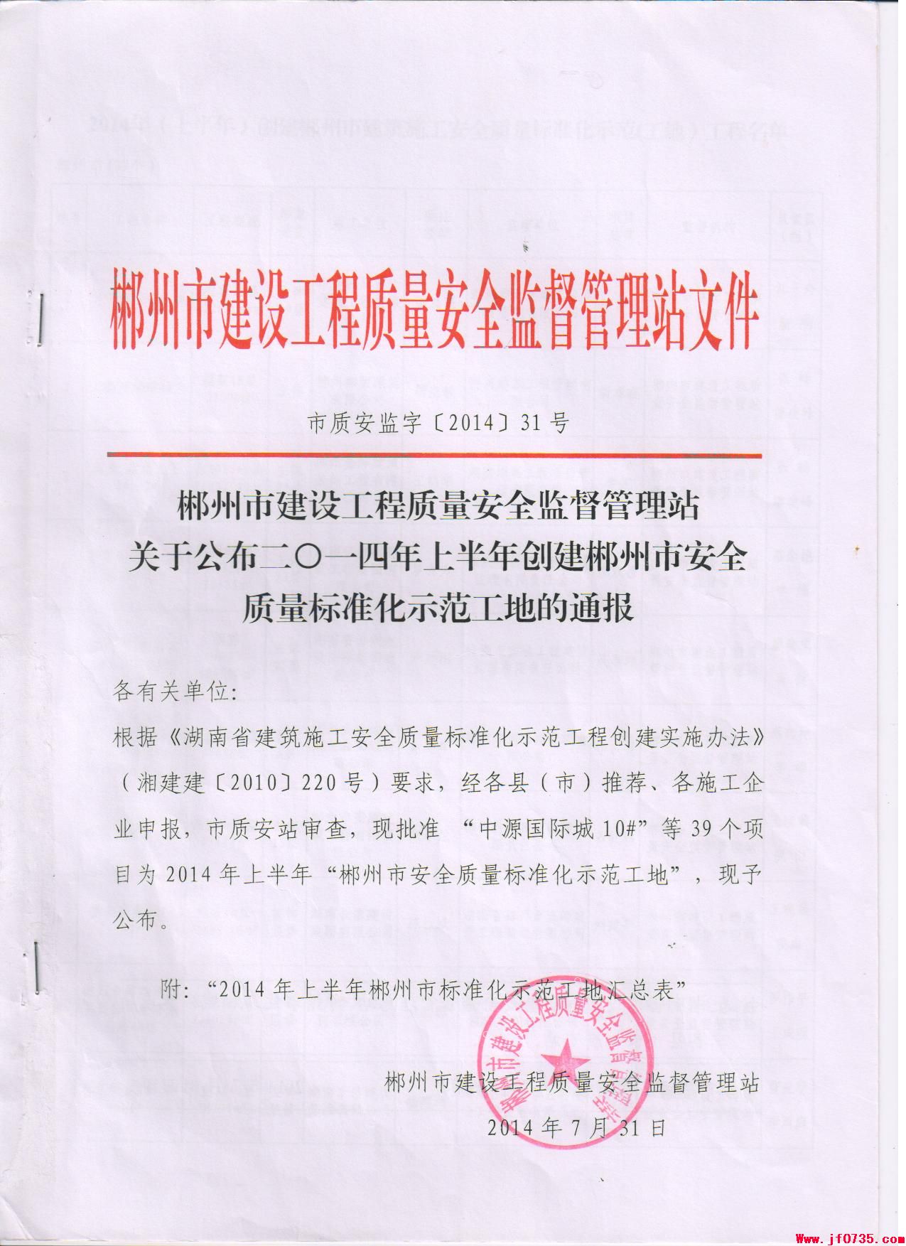 郴州市俊鋒建筑安裝工程有限公司建設(shè)的凱旋城項(xiàng)目、郴州出口加工區(qū)洞灣路項(xiàng)目均被評(píng)為“2014年度上半年郴州市安全質(zhì)量標(biāo)準(zhǔn)化示范工地”。
