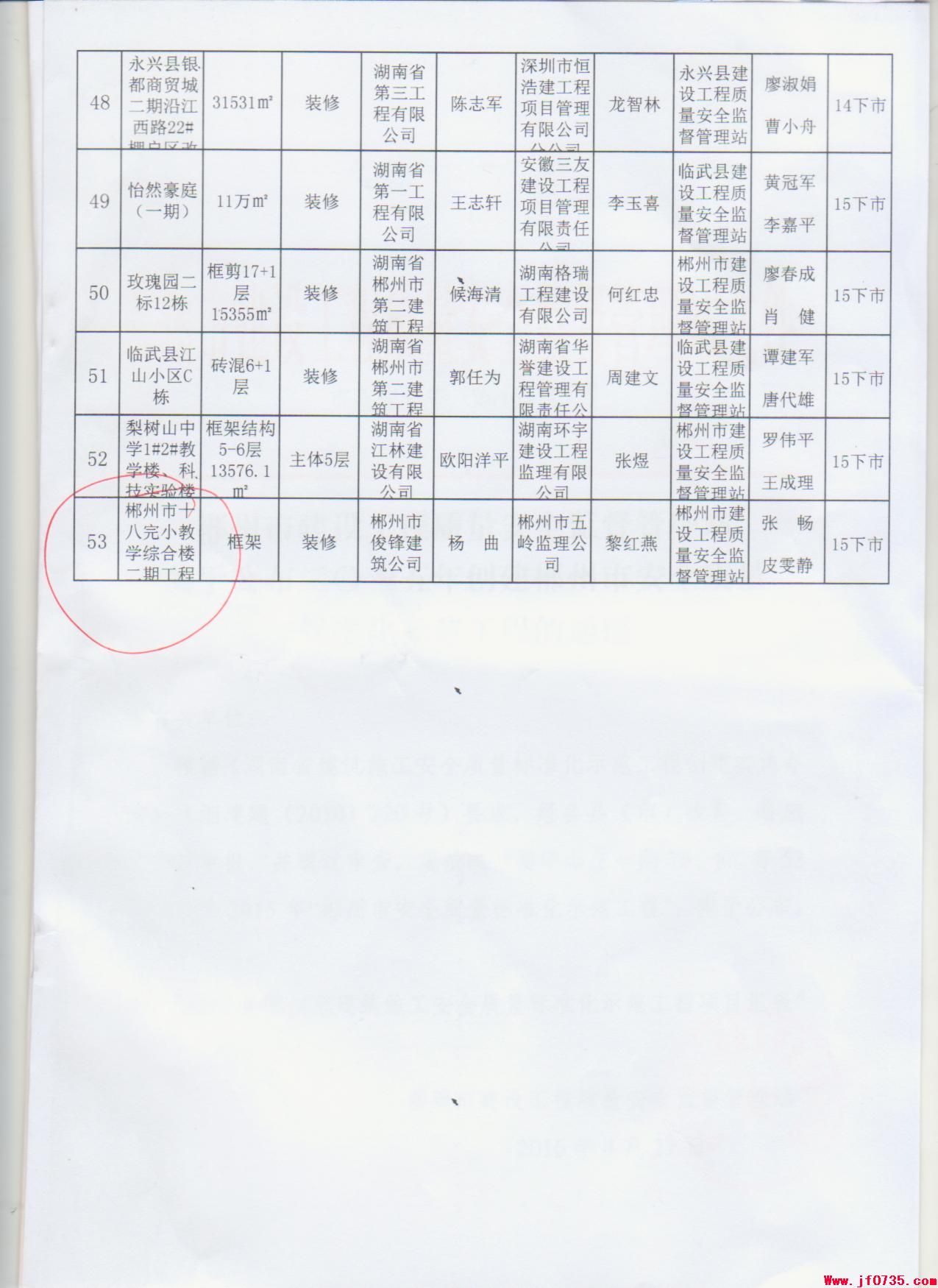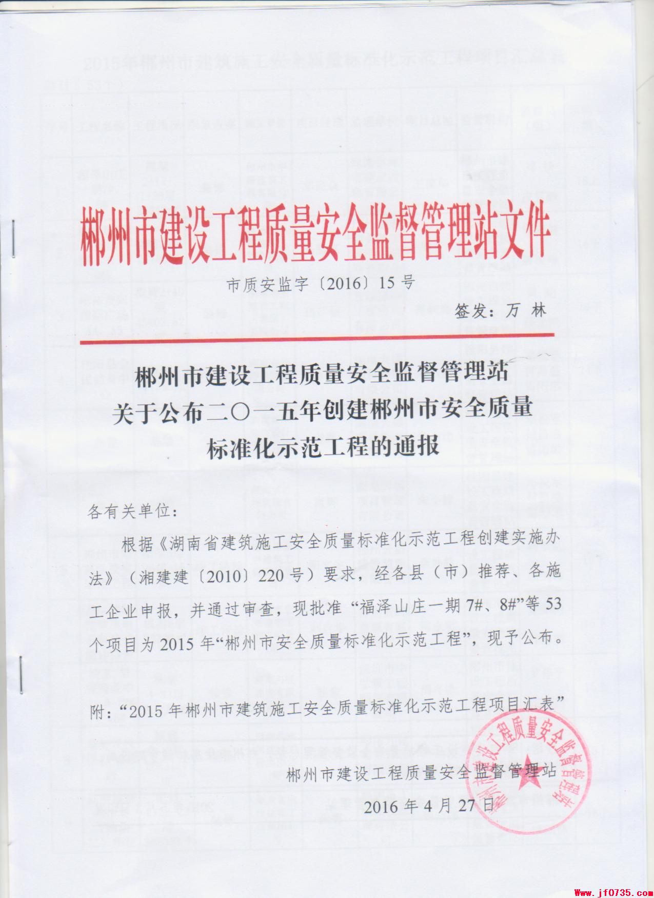 郴州市俊鋒建筑安裝工程有限公司建設(shè)的“郴州市十八完小教學(xué)綜合樓二期工程”被評為2015年郴州市安全質(zhì)量標(biāo)準(zhǔn)化示范工程。